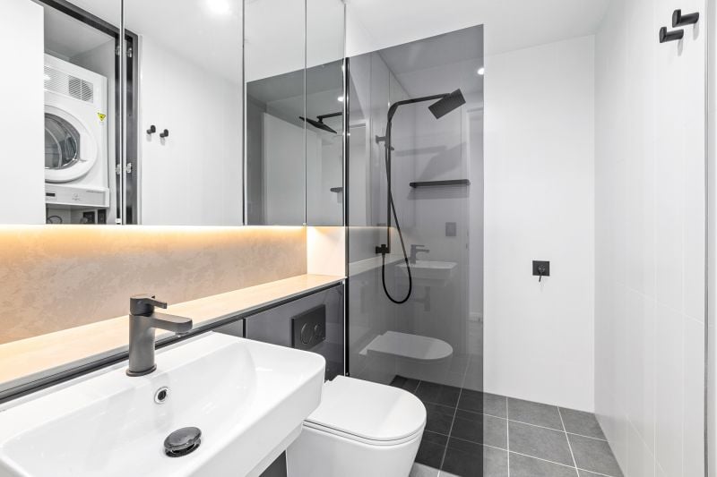- Stylish bathroom tiled floor to ceiling with plenty of mirrored cabinetry, recessed stone shelving & frameless smoked glass shower screen