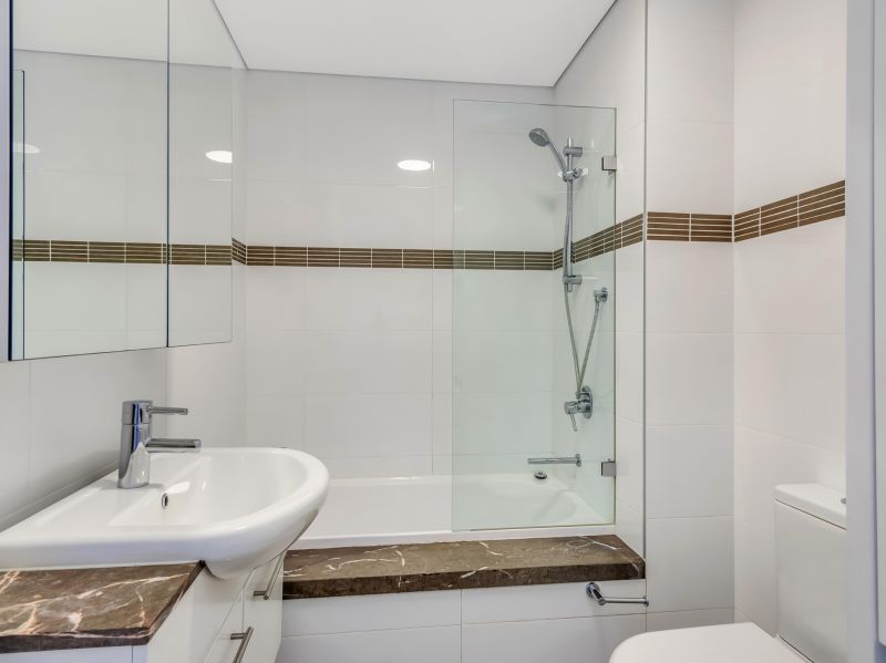 - Stylish bathroom tiled floor to ceiling with combined shower/bathtub, chic stone finishes & mirrored vanity with plenty of storage
