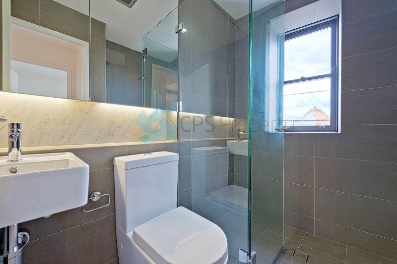 - Modern fully tiled bathroom with mirrored vanity, glass shower screen & ample storage
