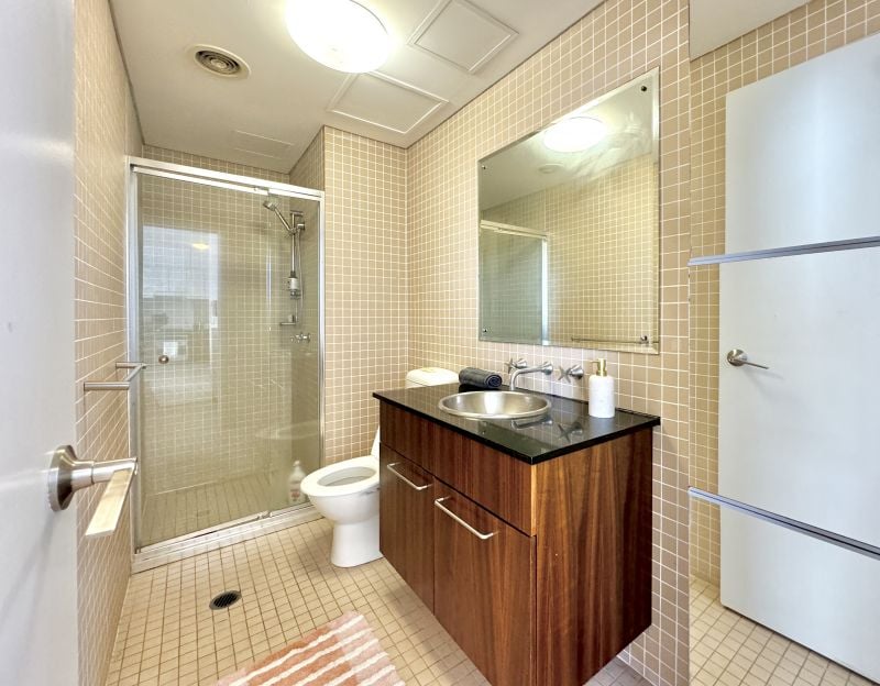 - Modern bathroom tiled floor to ceiling with mirrored vanity featuring stone benchtops & ample storage space